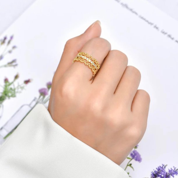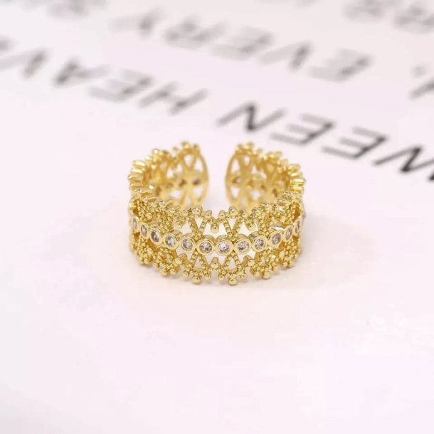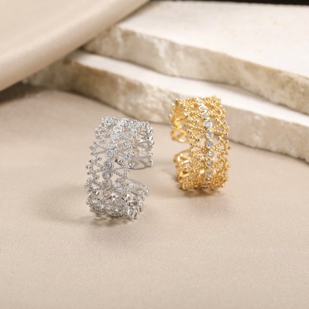 Smuk, justérbar ring, som er prydet med små klare zirkoner, hvilket giver et eksklusivt, stilfuldt udtryk.