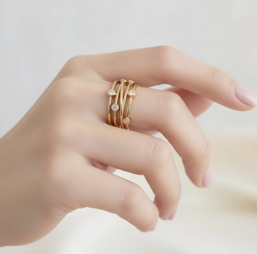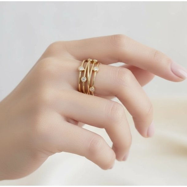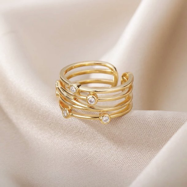 Smuk, bred, justérbar ring, som er udført i et feminint, tidløst design. Ringen er prydet med klare zirkoner, hvilket giver et stilfuldt udtryk.
