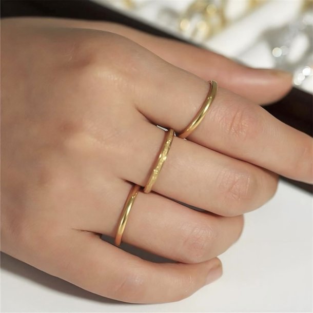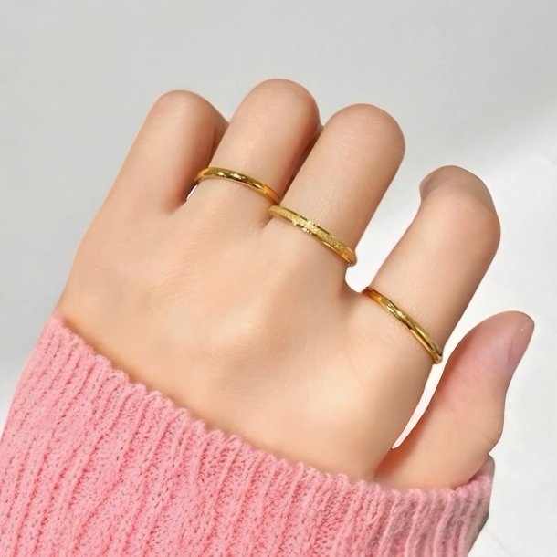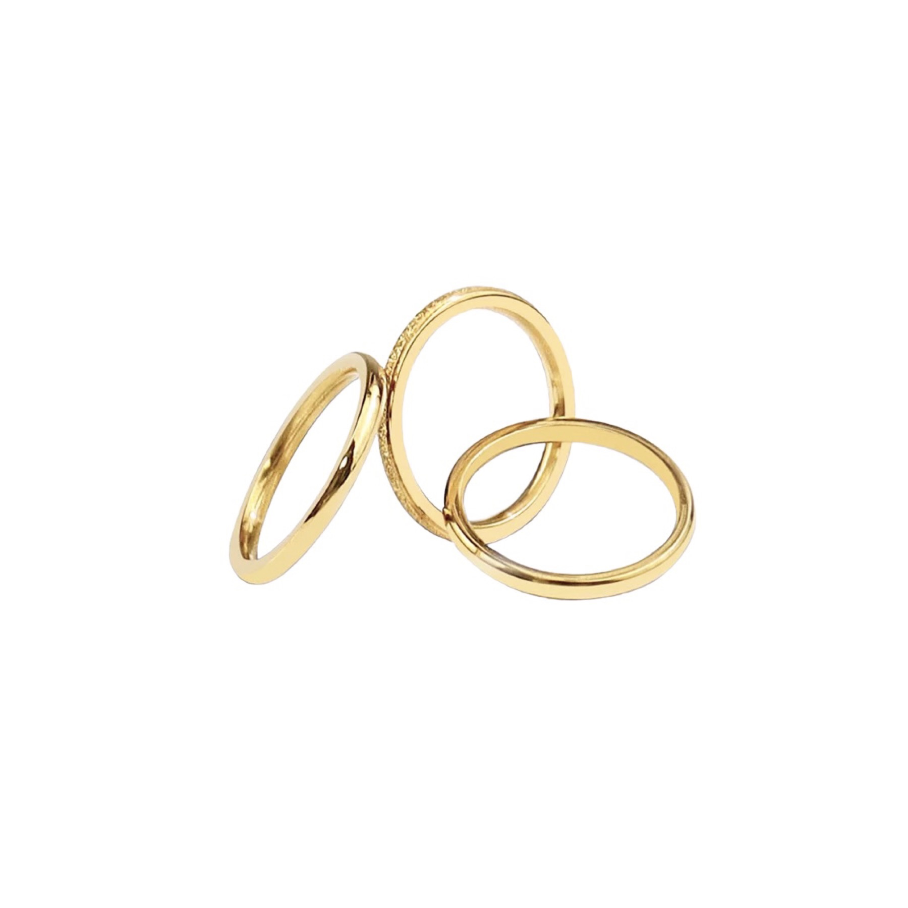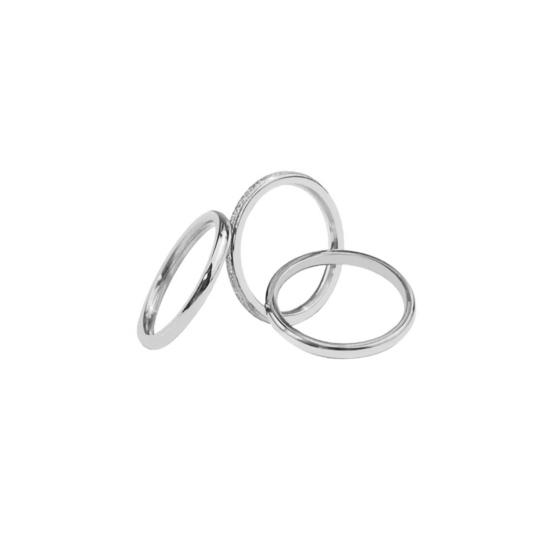 Flot ring-sæt i rustfrit ædelstål. Sættet består af tre smalle ringe, hvoraf to af dem har blank overflade og en af dem har en fin, glitrende "stardust" overflade. Ringene kan både bruges sammen eller hver for sig.