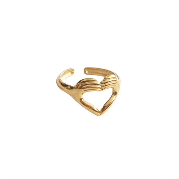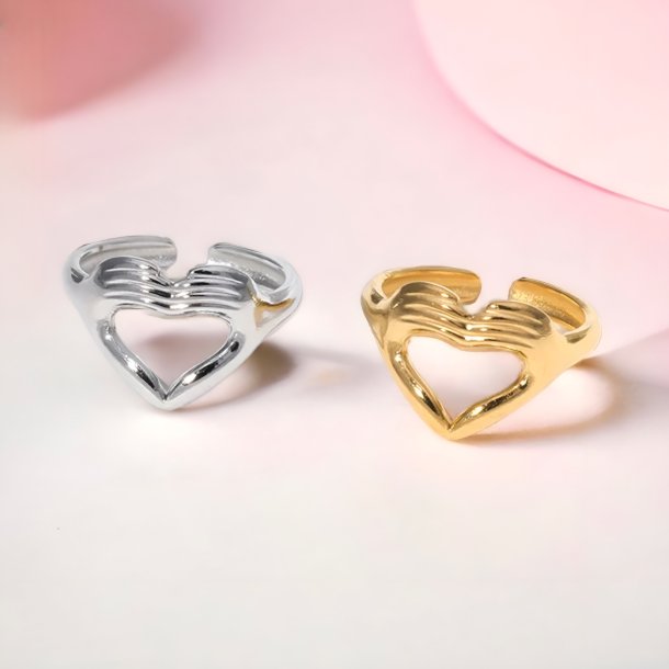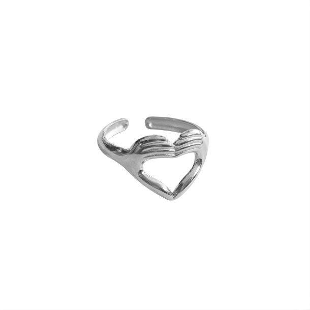Super flot, justérbar hjerte-ring, hvor hjertet er dannet af to hænder. Ringen er udført i et unikt, feminint design og kan matches med ethvert outfit.