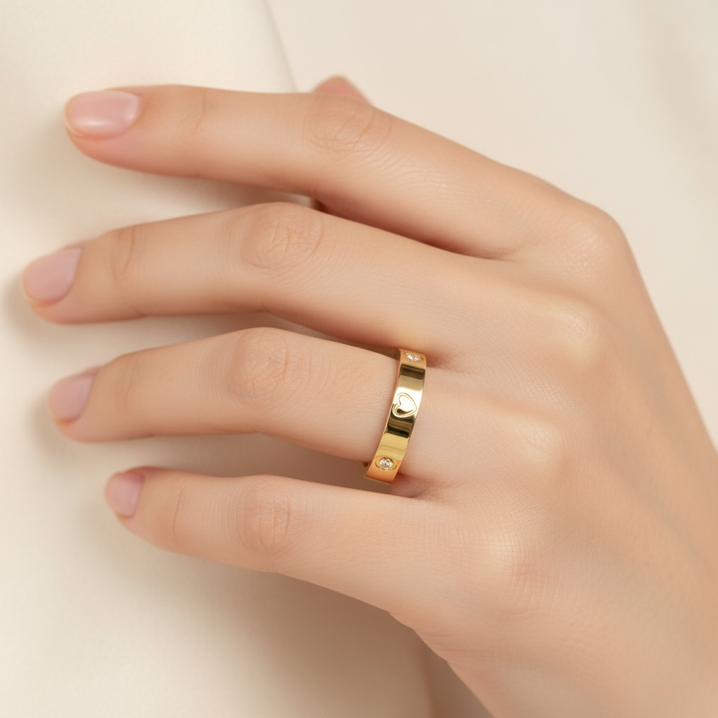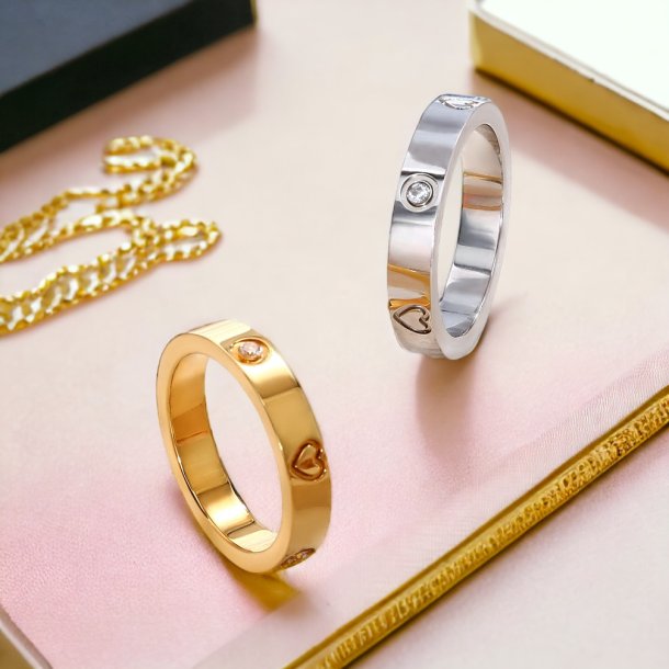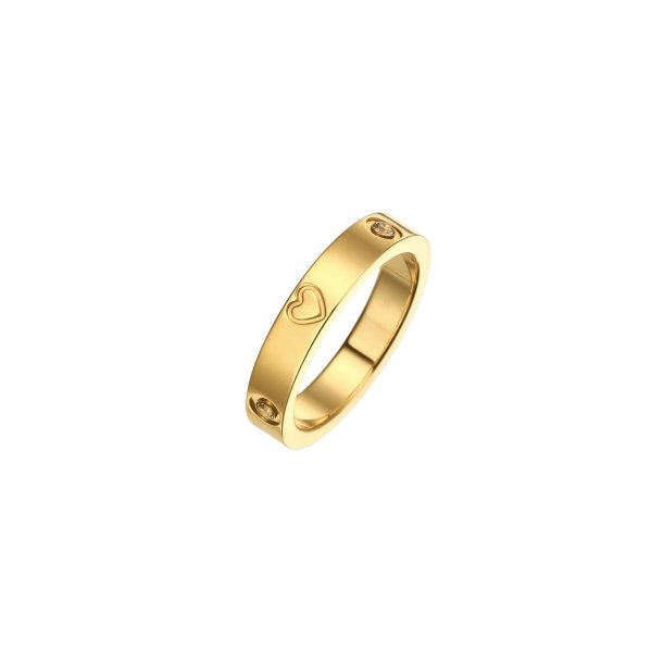 Smuk, klassisk ring i rustfrit ædelstål. Ringen er skiftevis prydet med et indgraveret hjerte og en lille, klar zirkon. Ringen er designet i et eksklusivt, feminint design og kan bruges alene eller kombineres med dine andre yndlings-ringe.