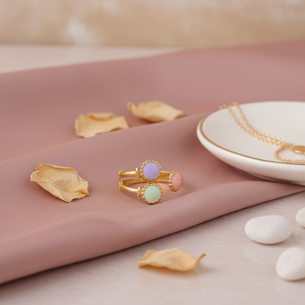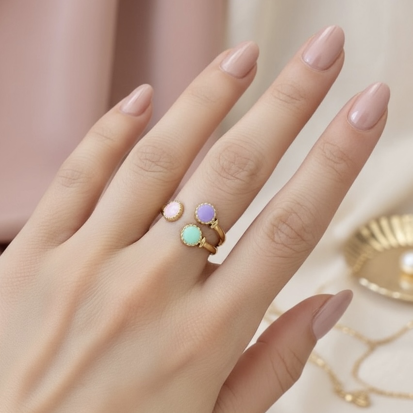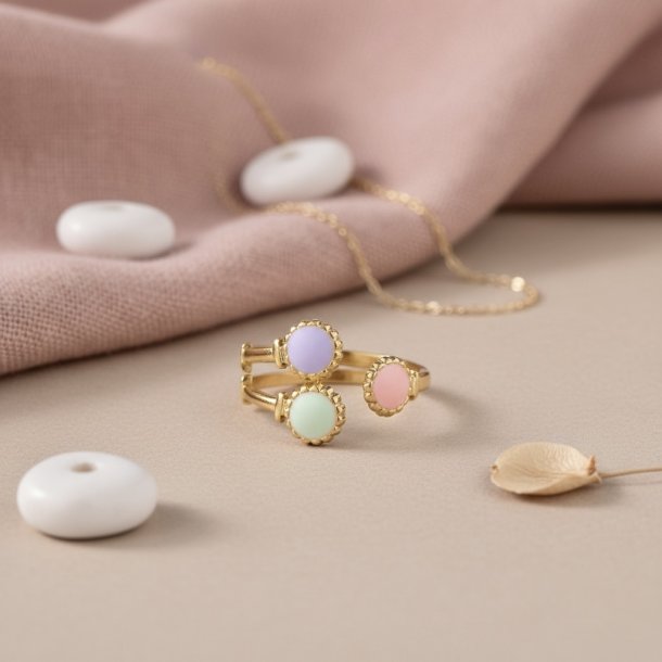 Flot, justérbar ring med små emalje-sten i de fineste, sarte farver. Ringen er udført i et feminint, moderne design og kan matches med ethvert outfit.