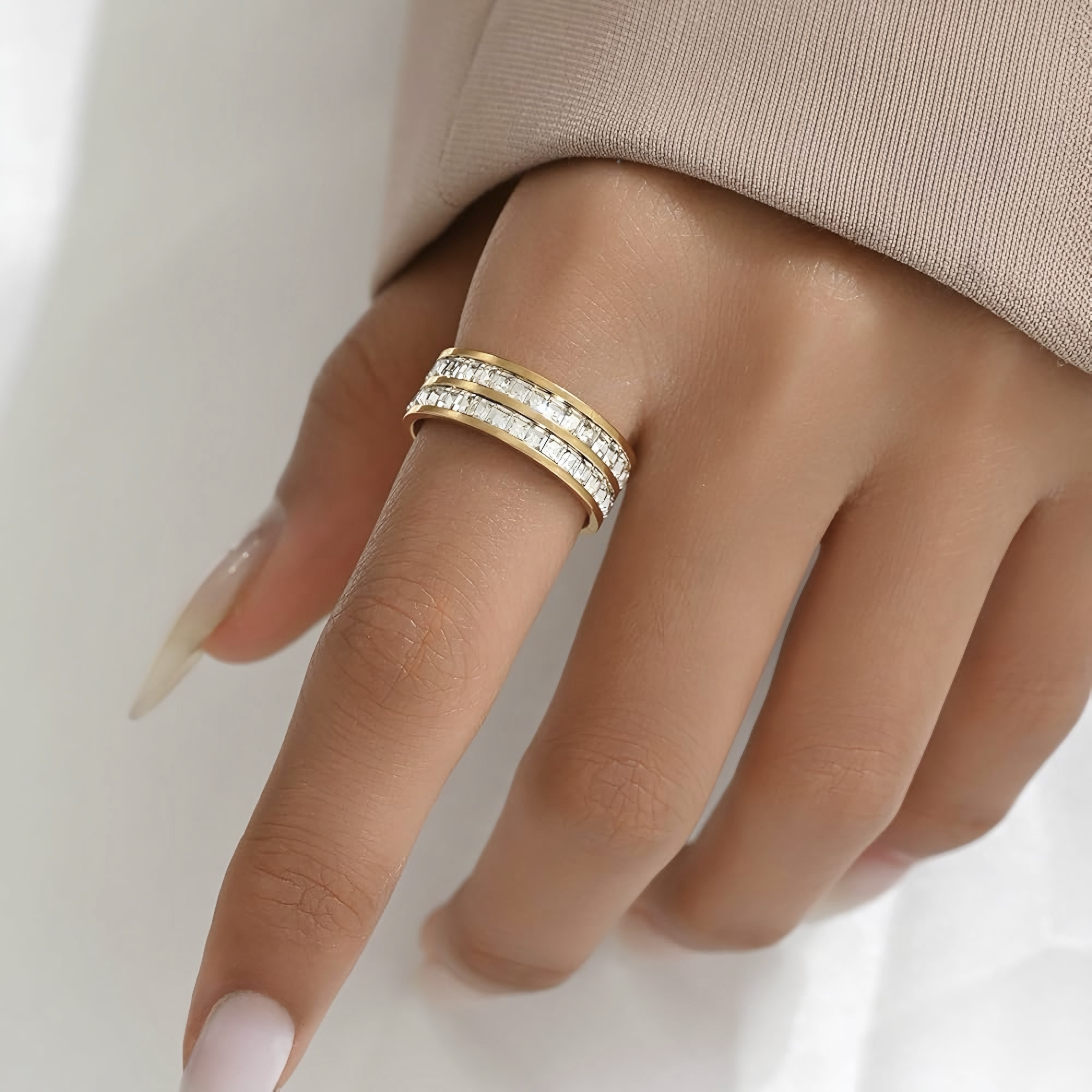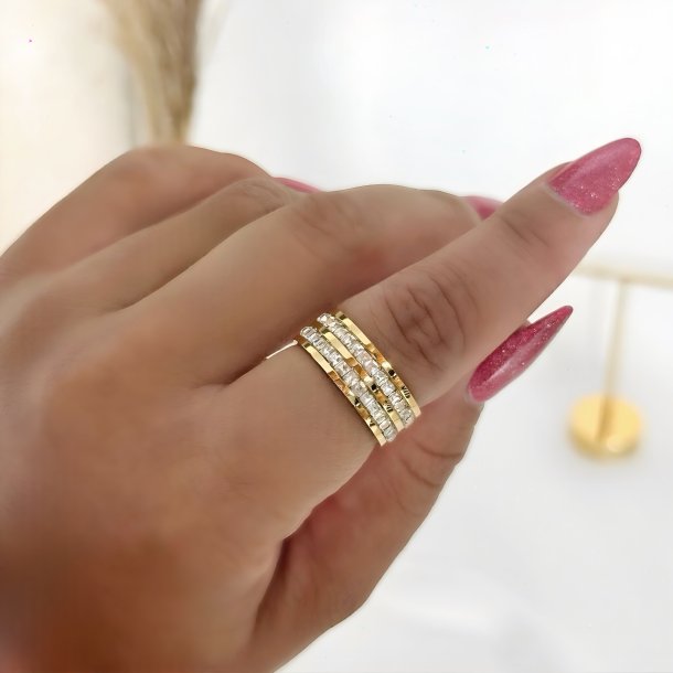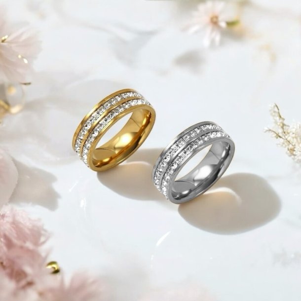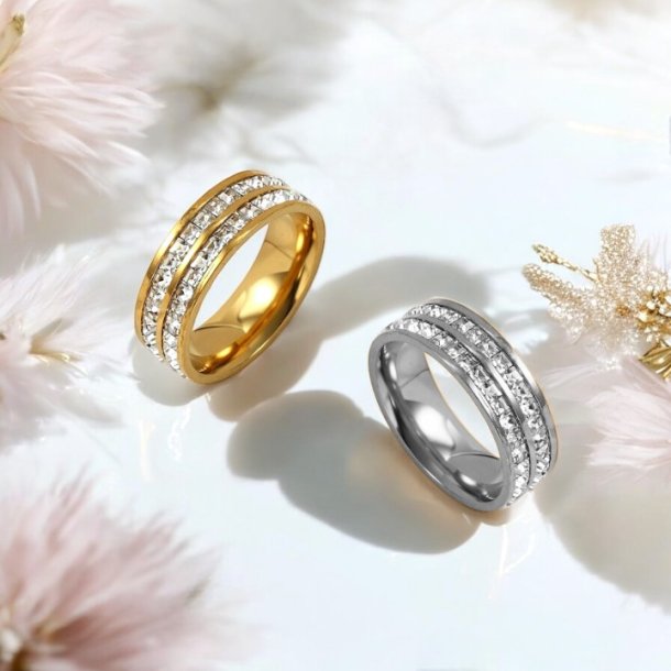 Smuk ring i rustfrit ædelstål. Ringen er hele vejen rundt prydet med små, klare zirkoner, som giver et eksklusivt, feminint udtryk.