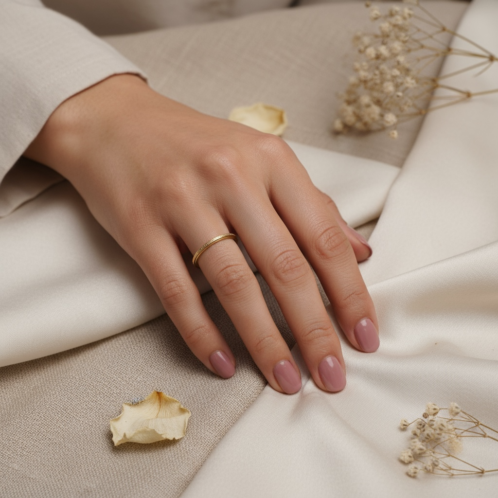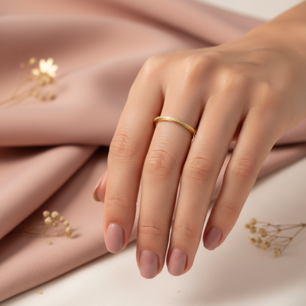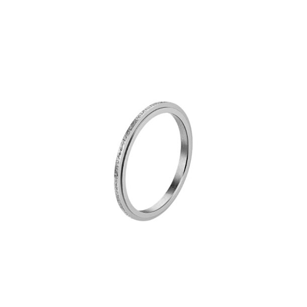 Enkel, smal "anti-stress" ring med en fin, "glitrende" overflade, hvilket giver ringen et feminint udtryk. Den midterste del kan dreje rundt, hvilket kan afhjælpe fx pillen i negle, neglerødder. Mange oplever det som afstressende og beroligende at have noget at pille ved, og ringen kan være med til at give ro og afhjælpe fx angst og uro i kroppen.