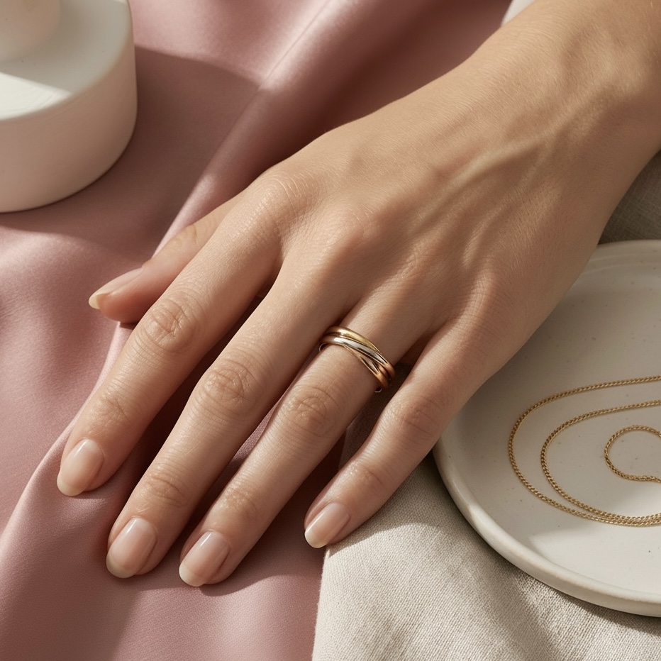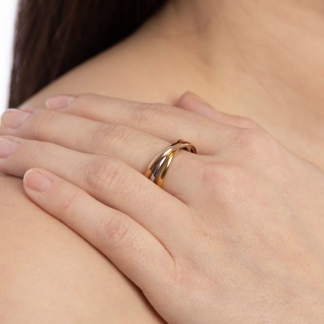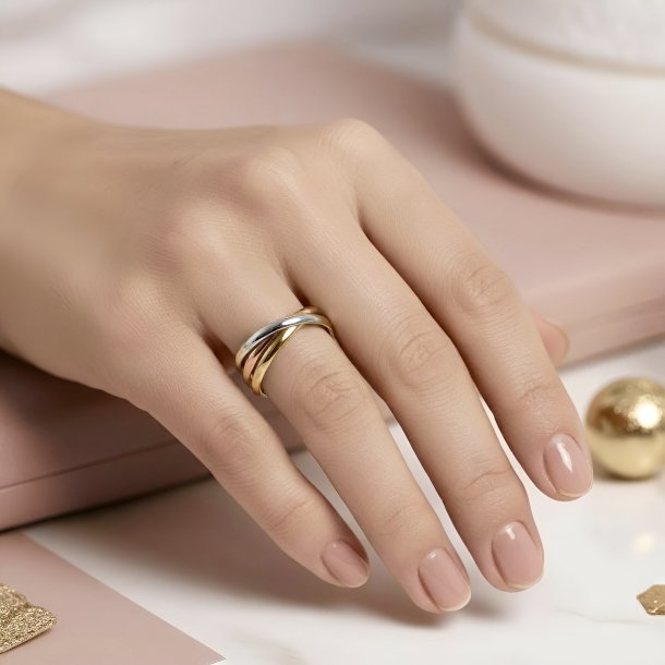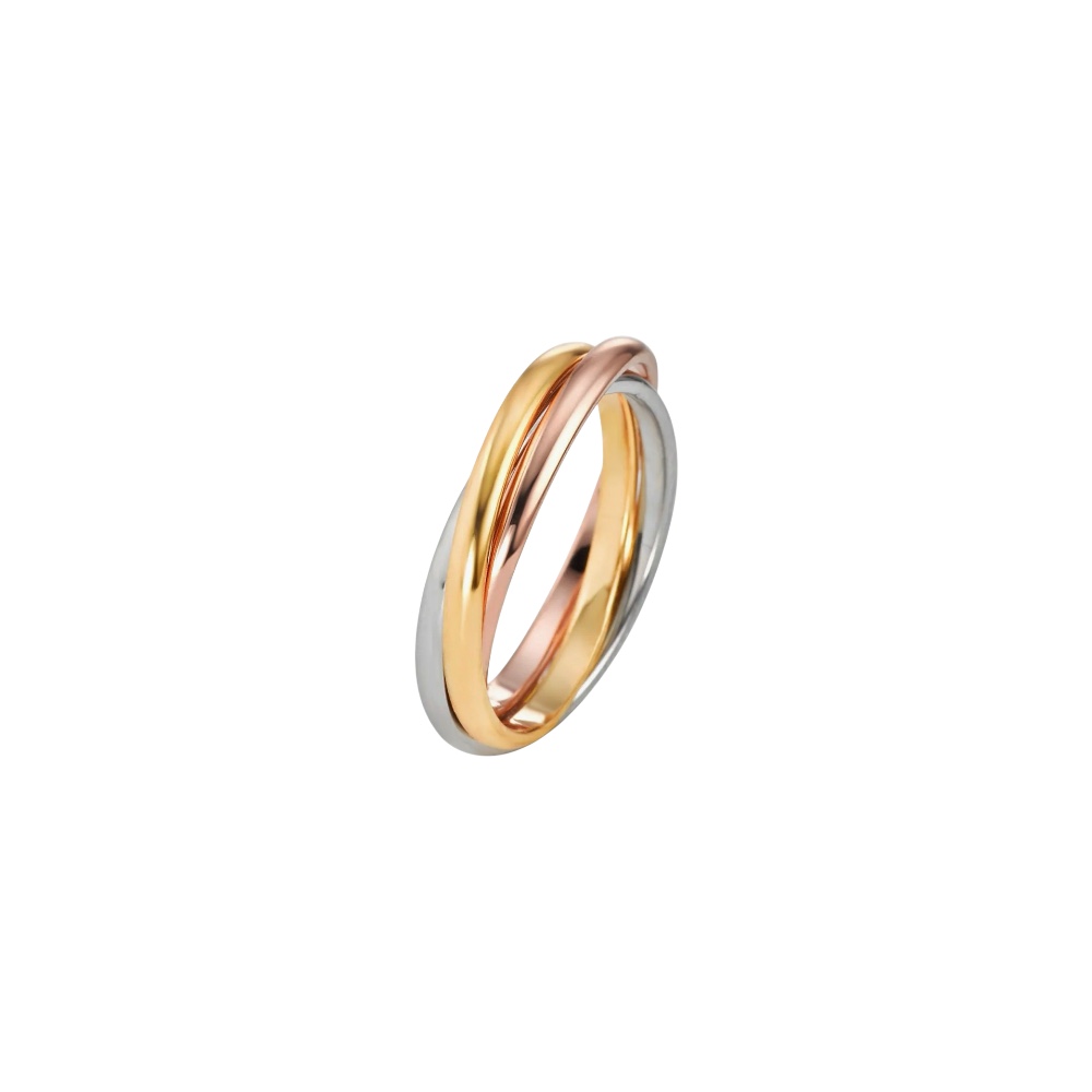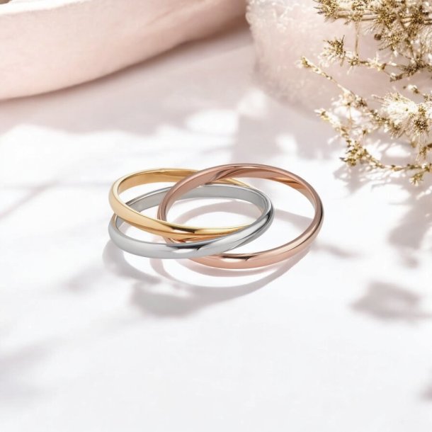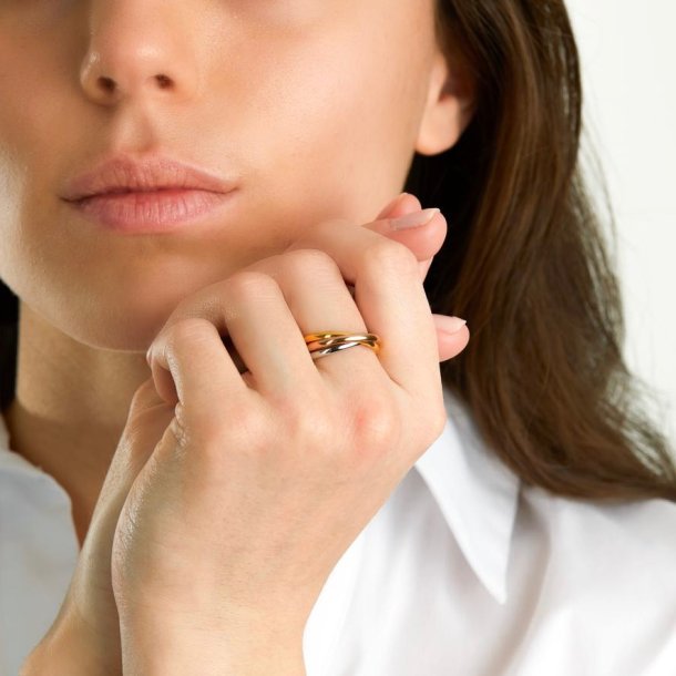 Fin tre-i-en ring i farverne sølv, guld og rosaguld. Man kan flytte/bevæge de tre ringe, hvilket kan afhjælpe fx pillen i negle, neglerødder. Mange oplever det som afstressende og beroligende at have noget at pille ved, og ringen kan være med til at give ro og afhjælpe fx angst og uro i kroppen.