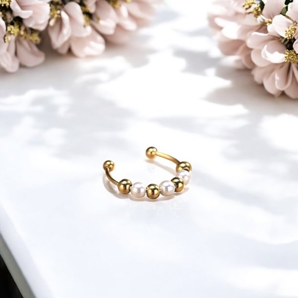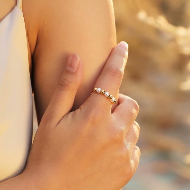 "Anti-stress" ring som er udført i et enkelt, feminint design. De små perler kan drejes/flyttes, hvilket kan afhjælpe fx pillen i negle, neglerødder. Mange oplever det som afstressende og beroligende at have noget at pille ved, og ringen kan være med til at give ro og afhjælpe fx angst og uro i kroppen.