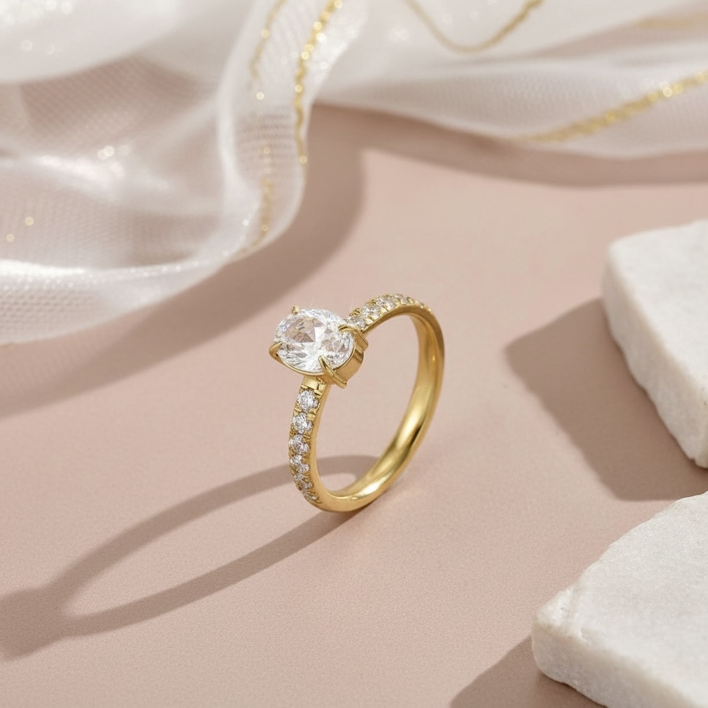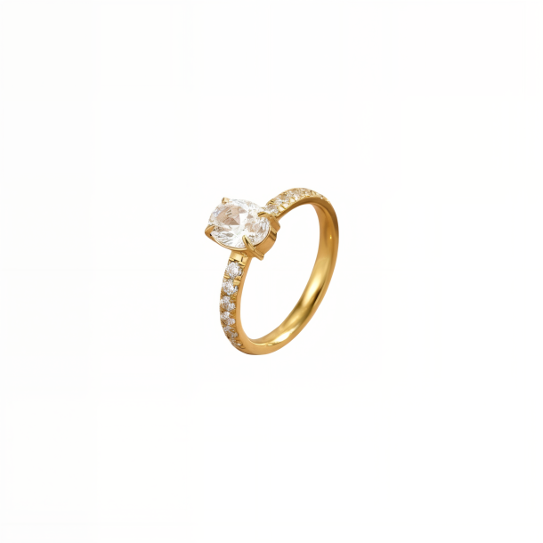 Smuk, feminin ring i rustfrit ædelstål. Ringen er prydet med små, klare zirkoner og fremtræder med et eksklusivt og luksuriøst udtryk.
