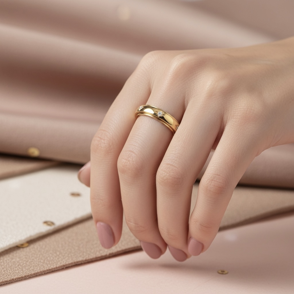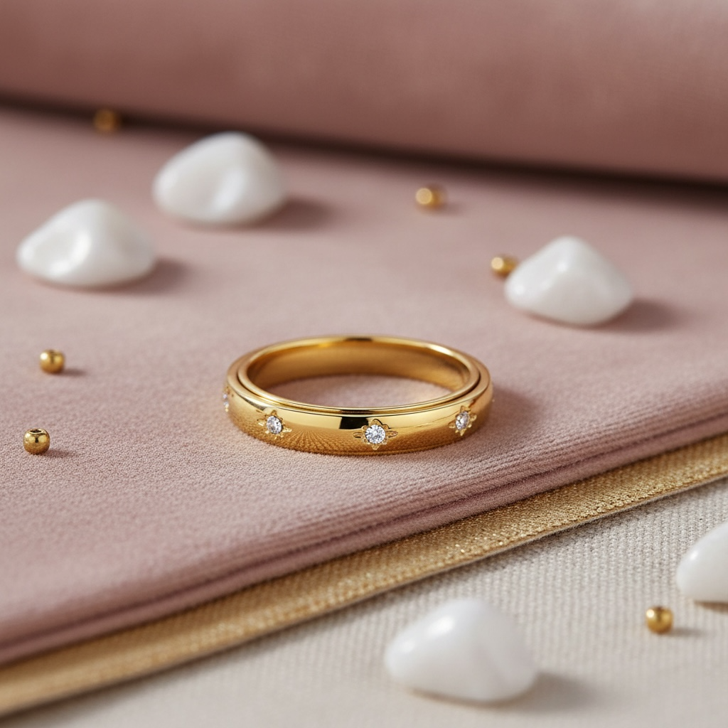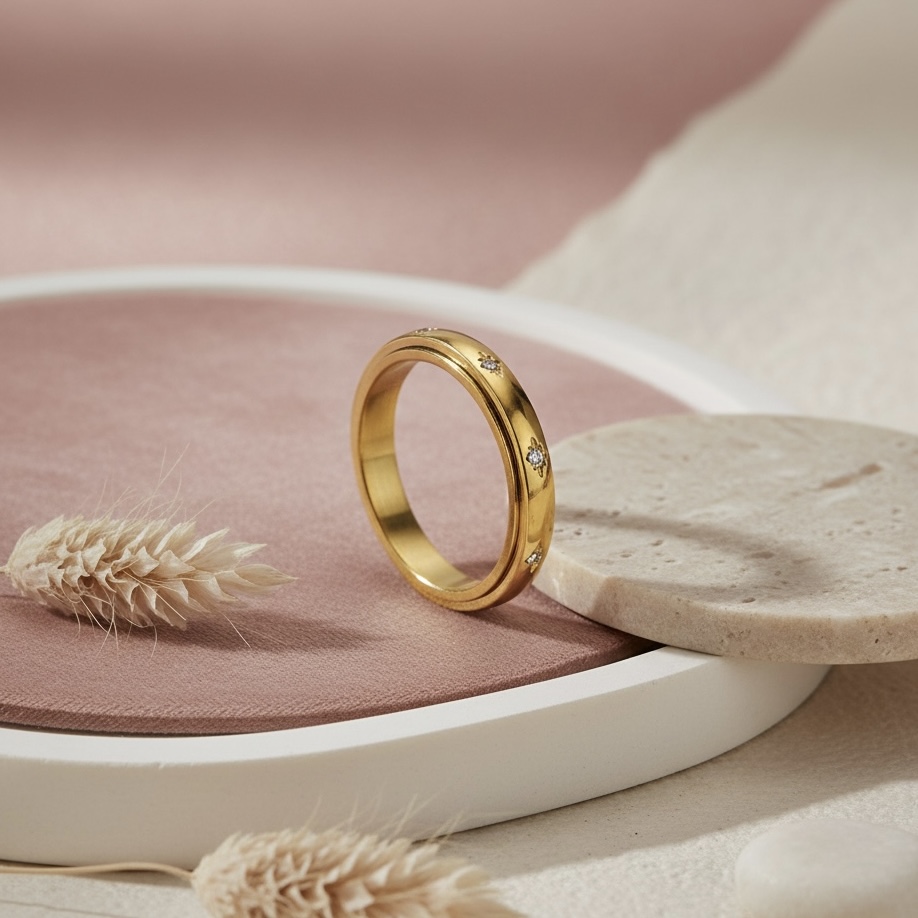 "Anti-stress" ring som er udført i et simpelt, feminint design. Den midterste del kan dreje rundt, hvilket kan afhjælpe fx pillen i negle, neglerødder. Mange oplever det som afstressende og beroligende at have noget at pille ved, og ringen kan være med til at give ro og afhjælpe fx angst og uro i kroppen.