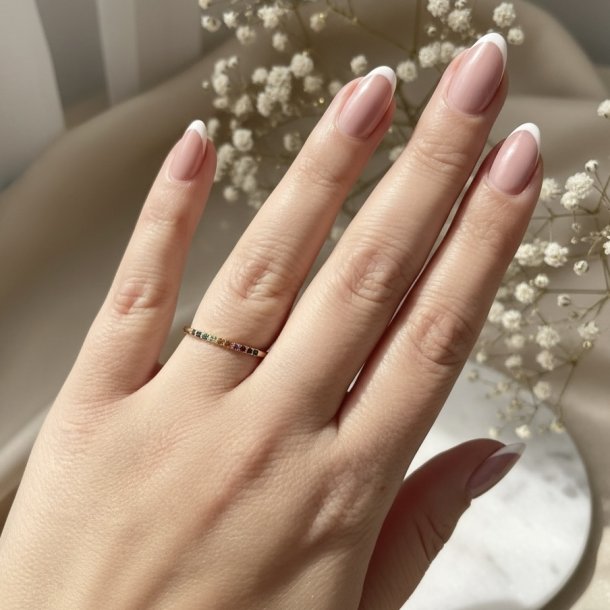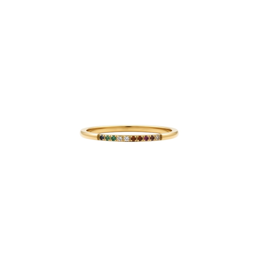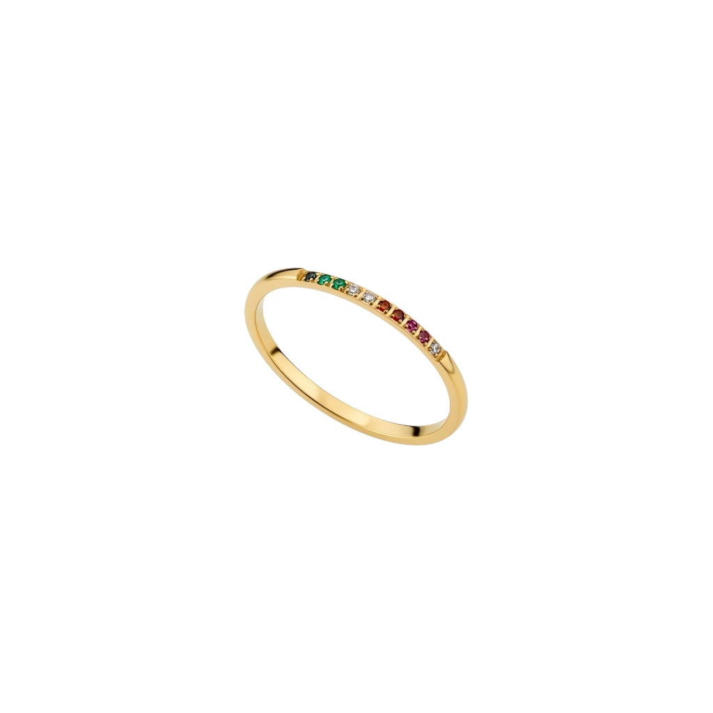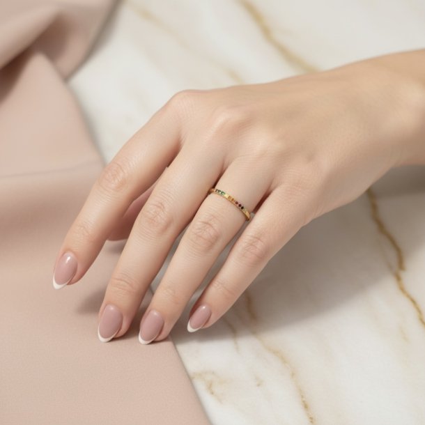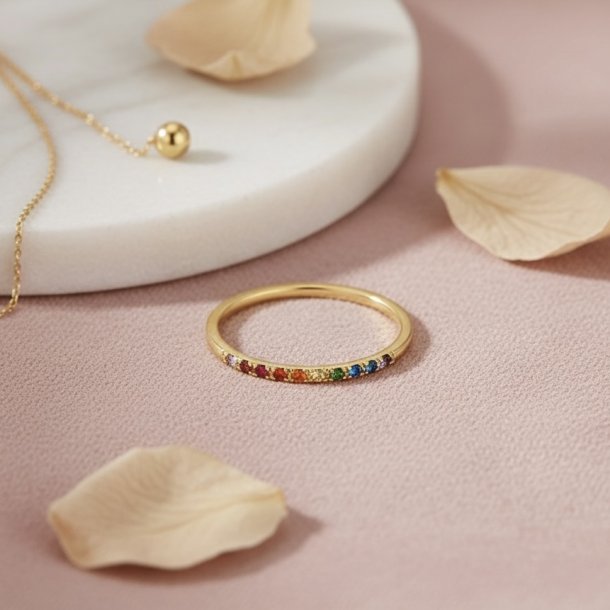 Smuk, smal ring i rustfrit ædelstål. Ringen er prydet med små zirkoner i forskellige farver, hvilket giver et eksklusivt, unikt udtryk.