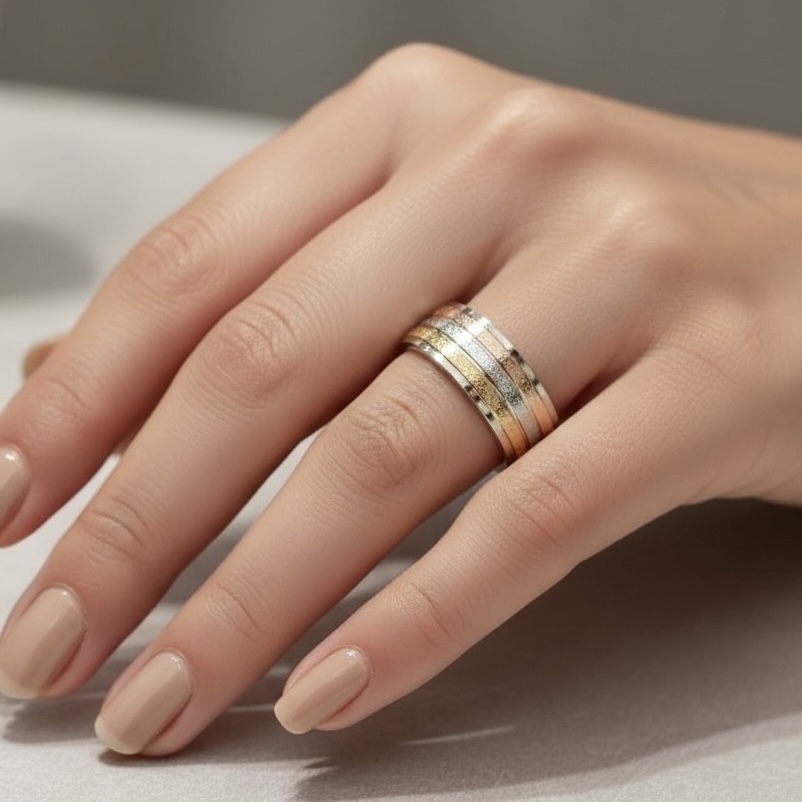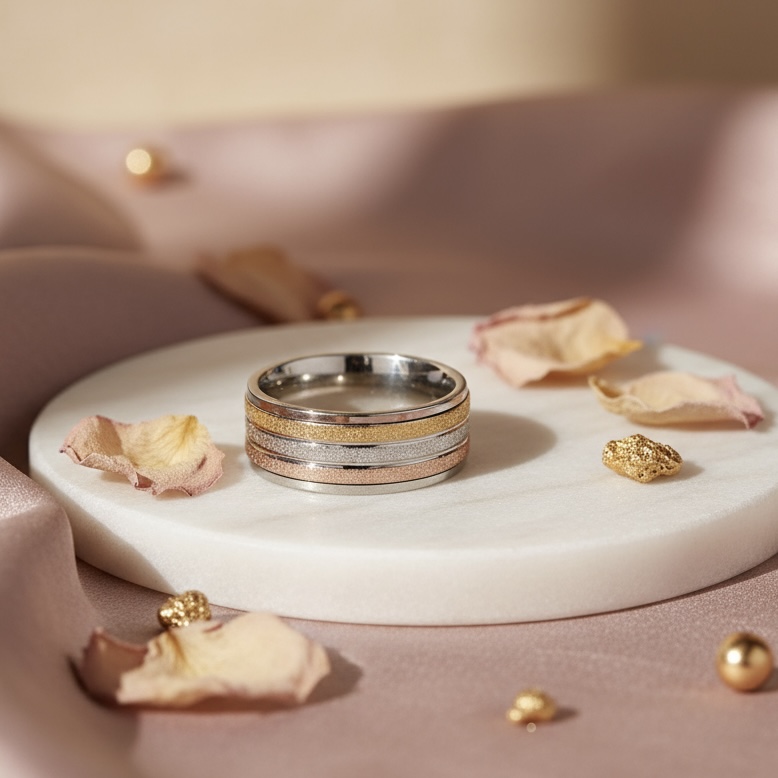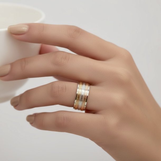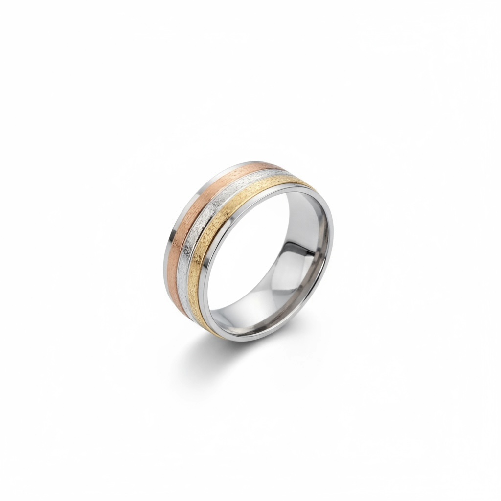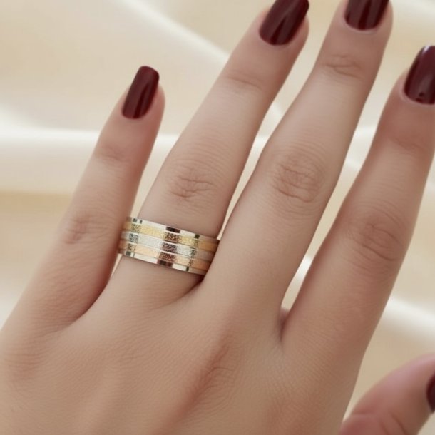 Flot, bred ring i rustfrit stål. Ringen har en smuk, glitrende "stardust" overflade i guld/sølv/rosaguld. Ringen er designet i et tidløst og eksklusivt design.