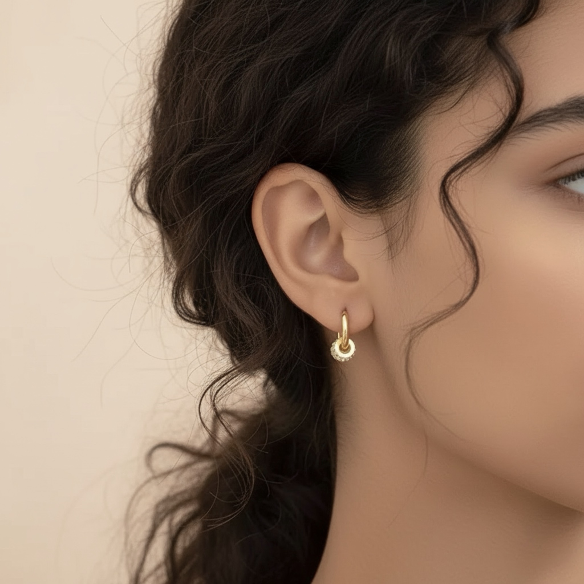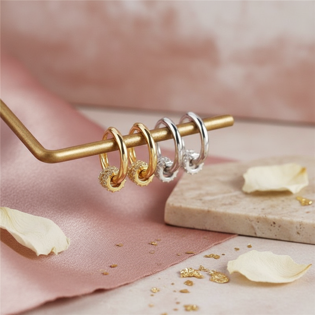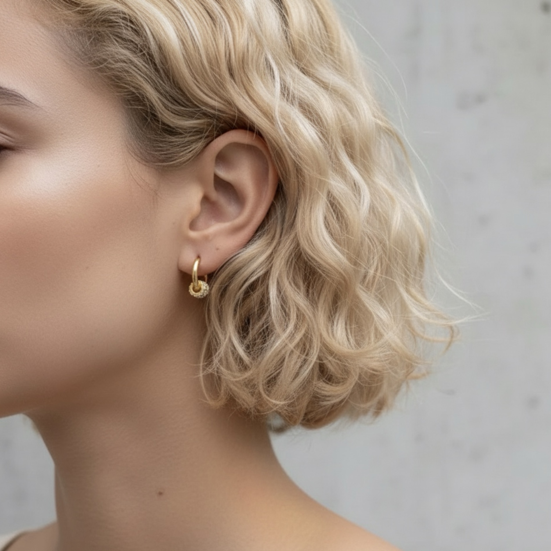 Smukke små, hoops med tre runde vedhæng med klare zirkoner. Øreringene kan bruges med eller uden vedhængene. Øreringene har et eksklusivt, feminint udtryk og passer perfekt til både hverdag og fest.