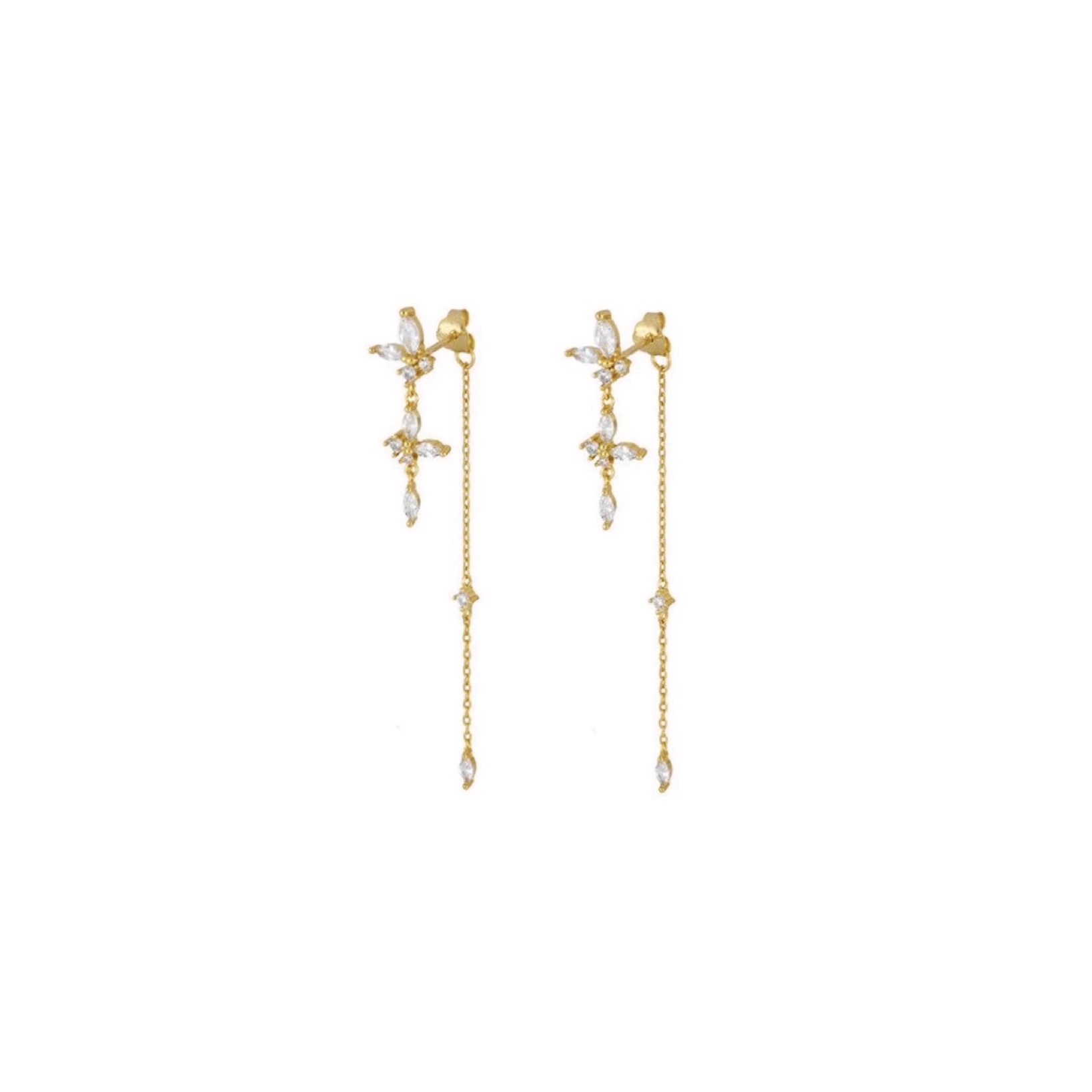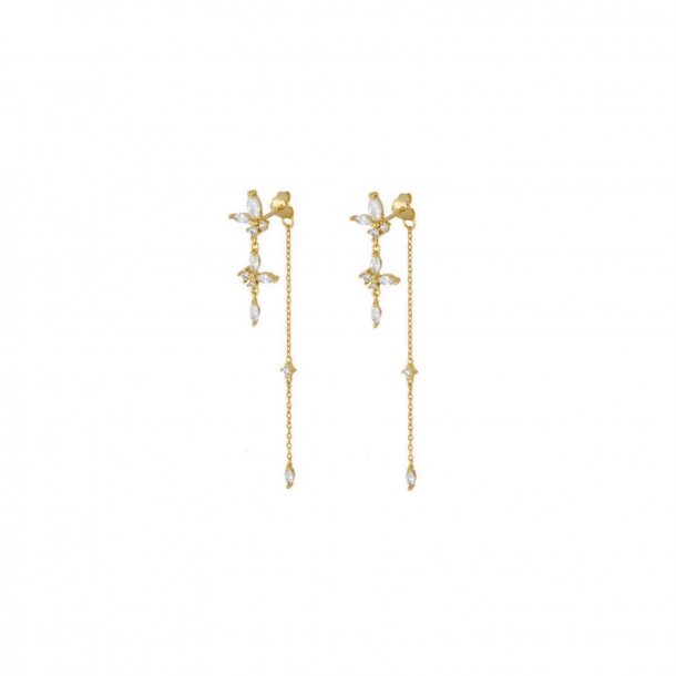 De smukkeste lange øreringe som er prydet med klare, skinnende zirkoner. Øreringene kan også bruges med en almindelig lås for et mere enkelt udtryk.