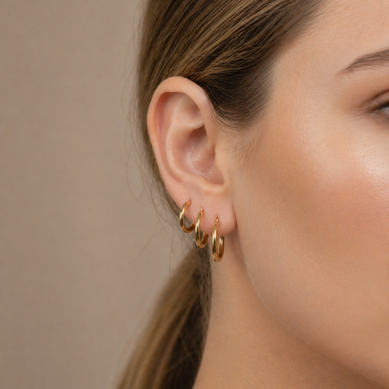 Vores enkle, populære "Basic Hoops" fås nu i én smykkepakke, som består af 3 valgfrie par hoops. Øreringene er af rustfrit ædelstål og fås i fem forskellige størrelser.