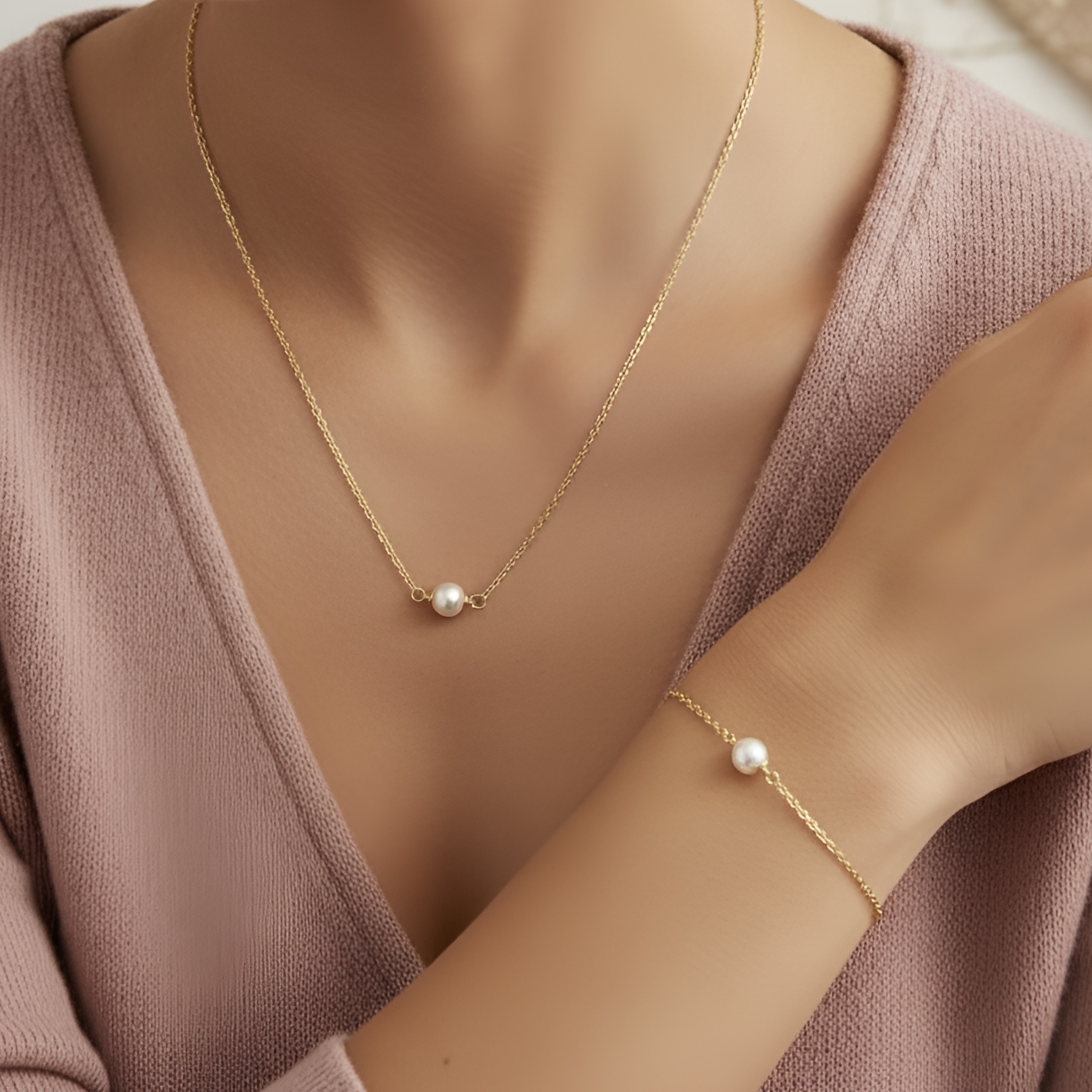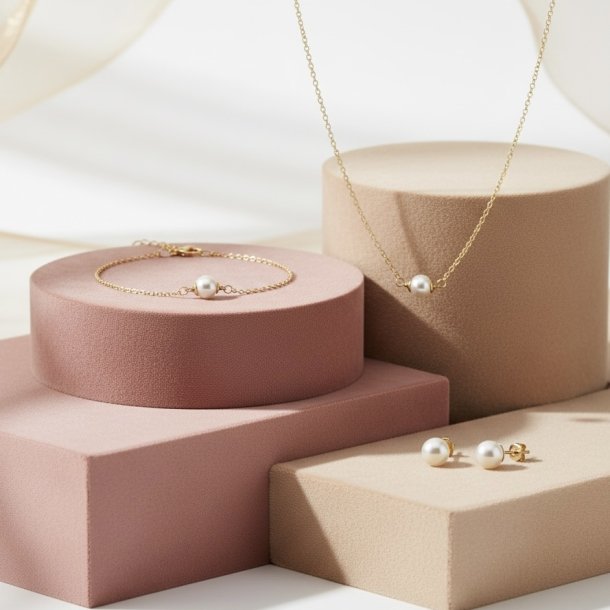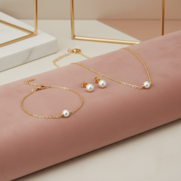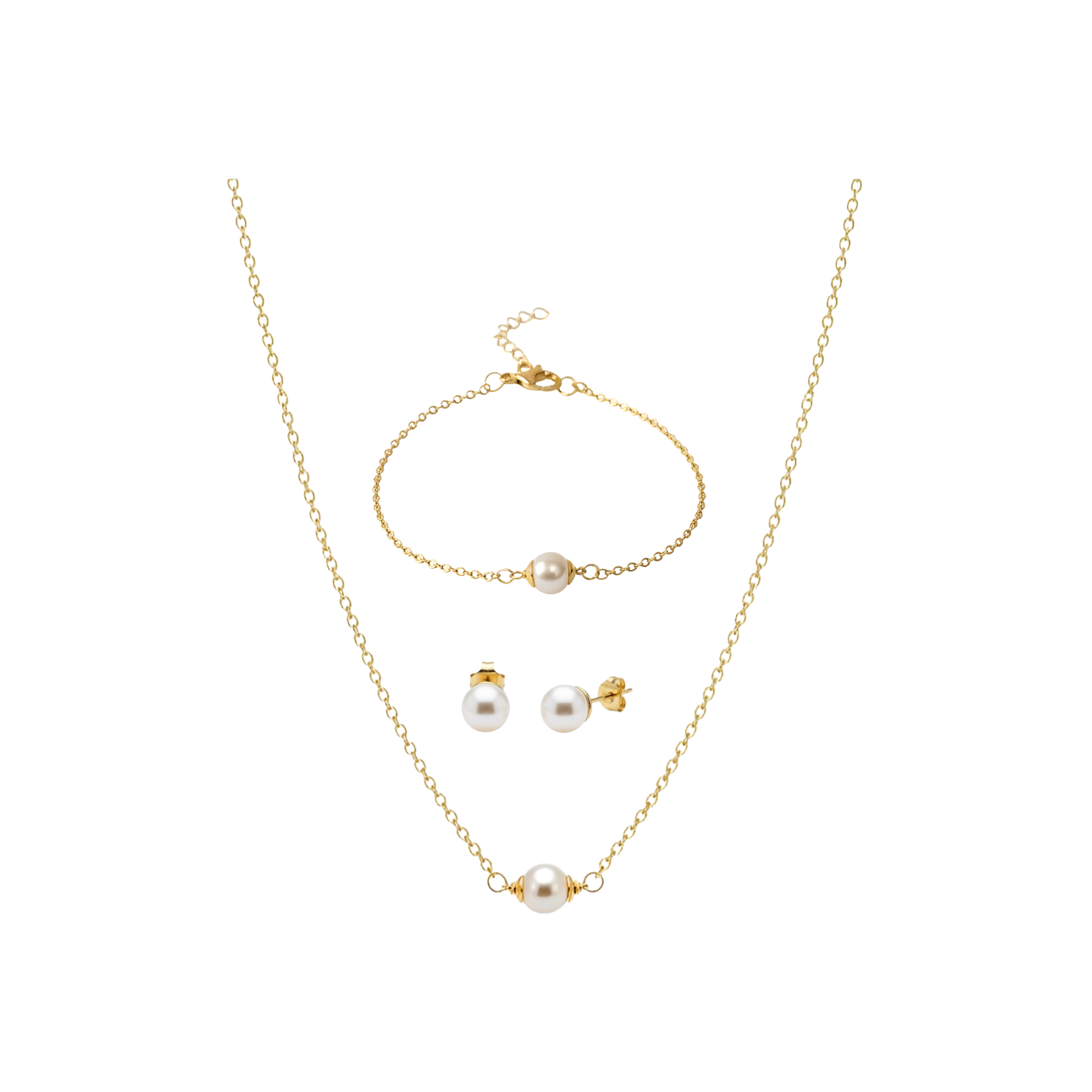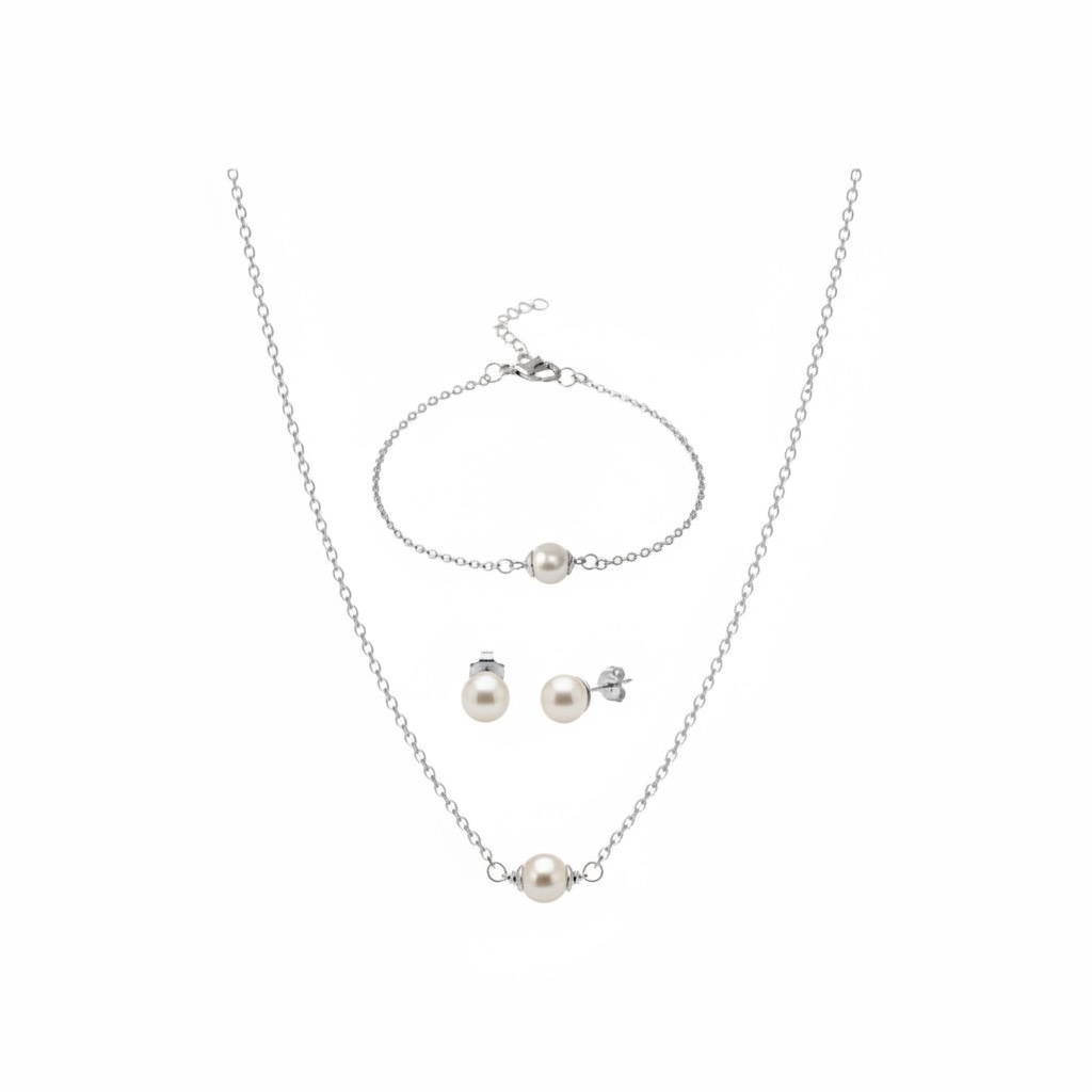 Fint, klassisk perle-smykkesæt bestående af halskæde, armbånd og øreringe. Smykkerne er af rustfrit ædelstål og passer til ethvert look.