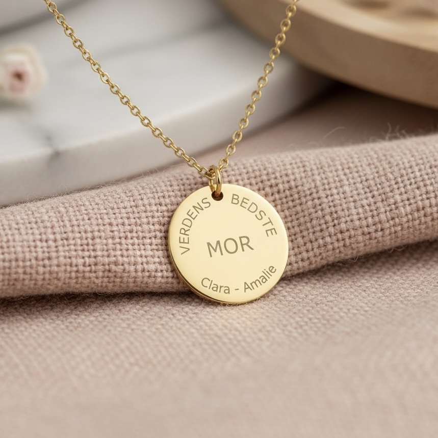 “VERDENS BEDSTE” er indgraveret øverst. Din tekst placeres i midten, og evt. ekstra tekst indgraveres nederst langs kanten – perfekt til en kort besked som “Jeg elsker dig” eller “Tak for dig”.