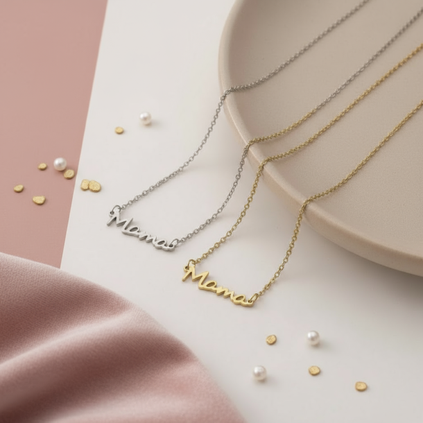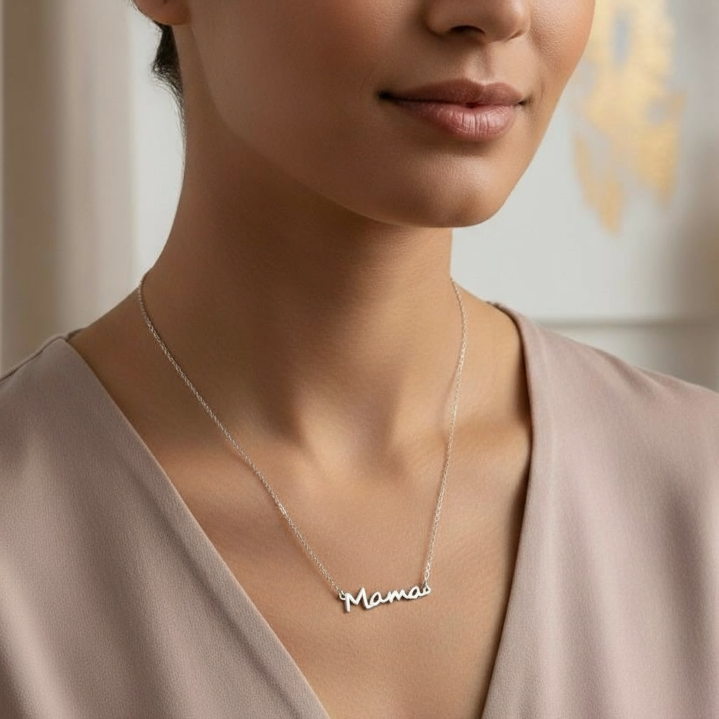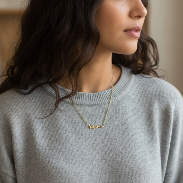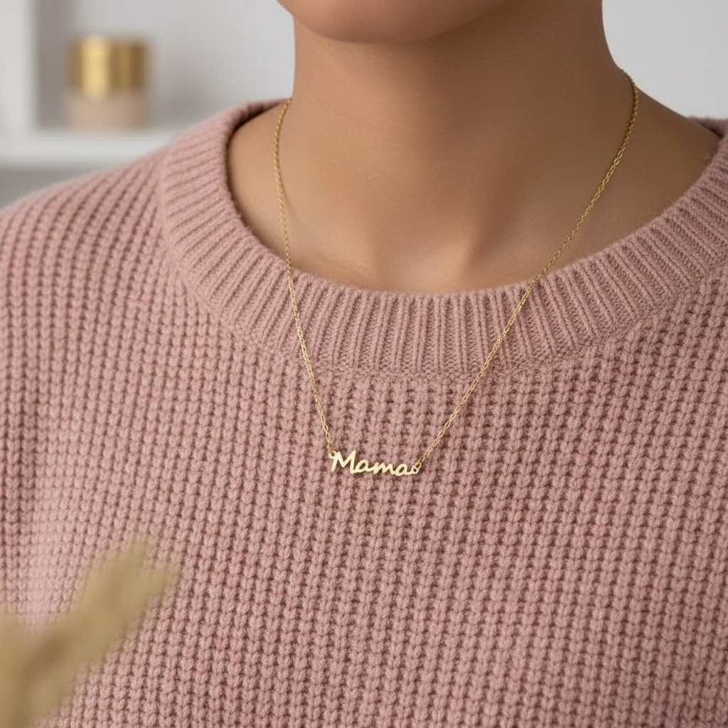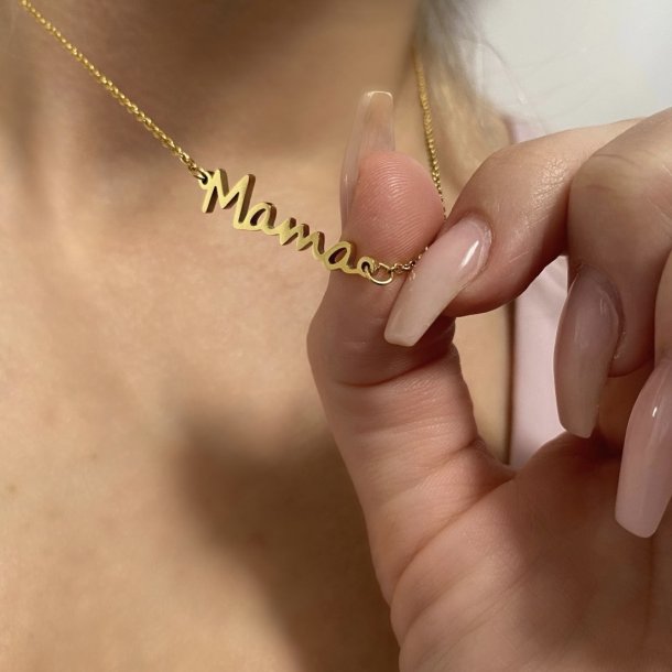 Fin halskæde i rustfrit ædelstål med skriften "Mama". Halskæden er den perfekte gave til én mor, du har holder af.