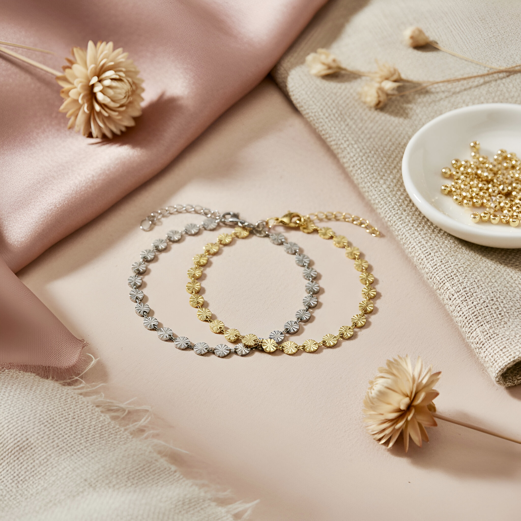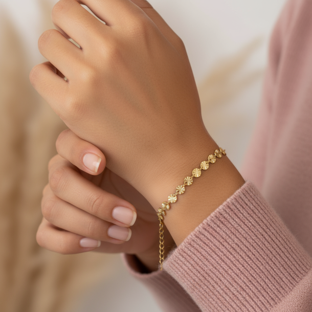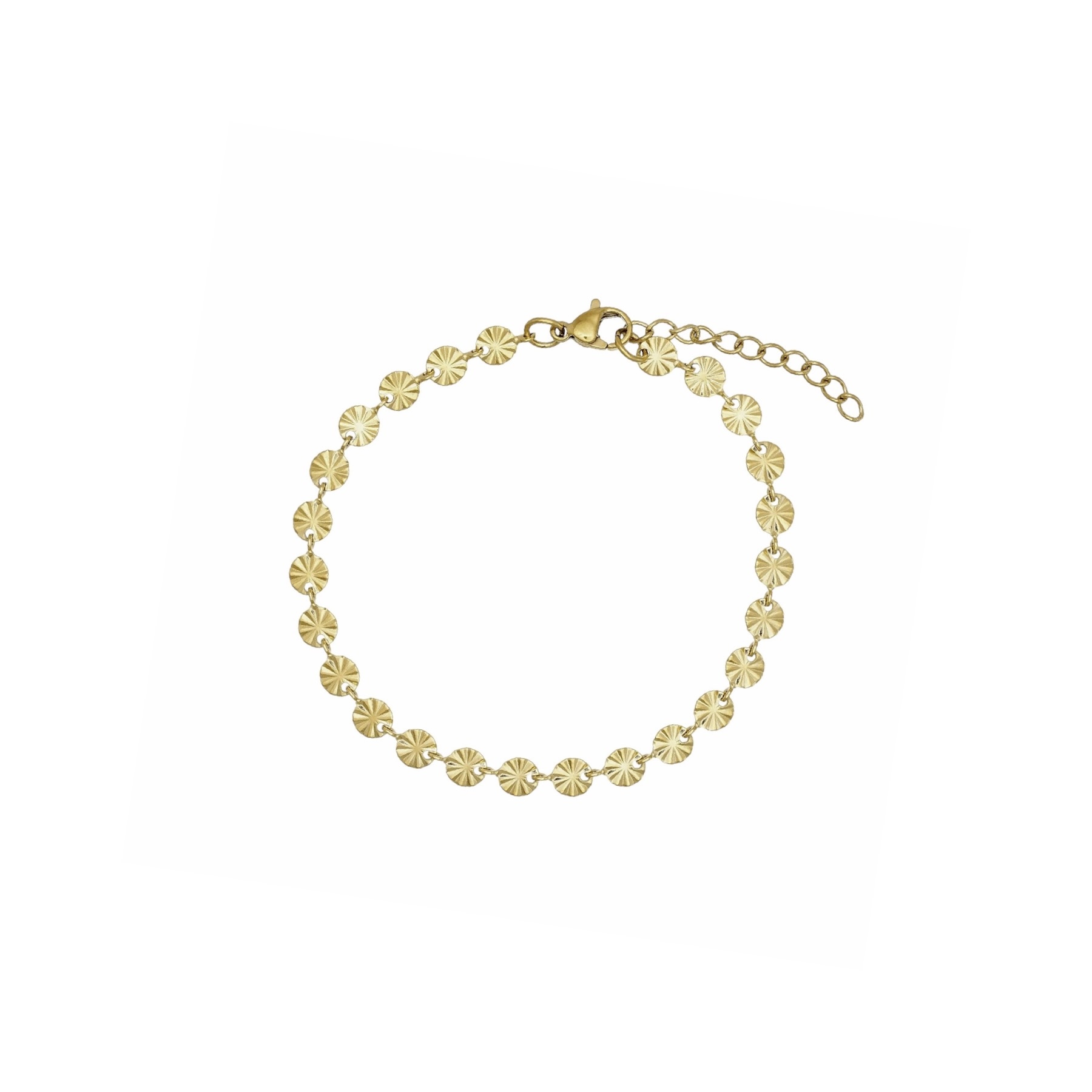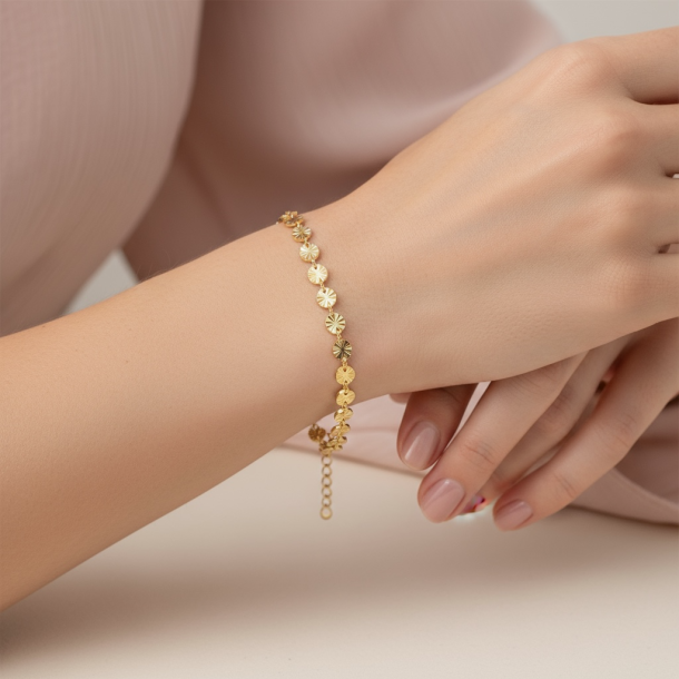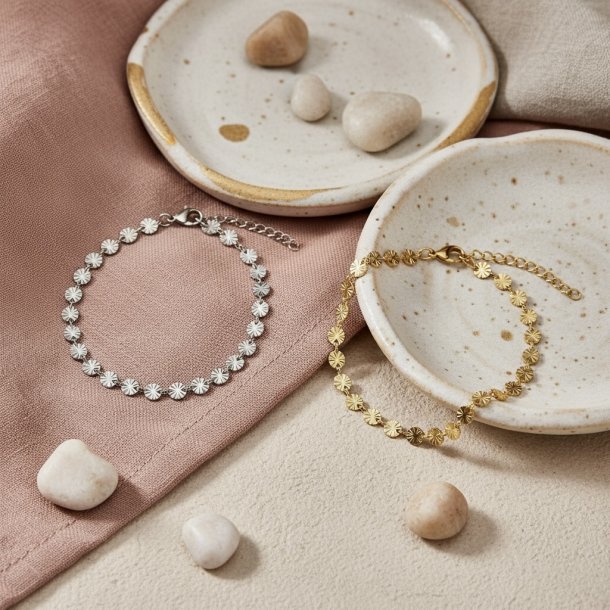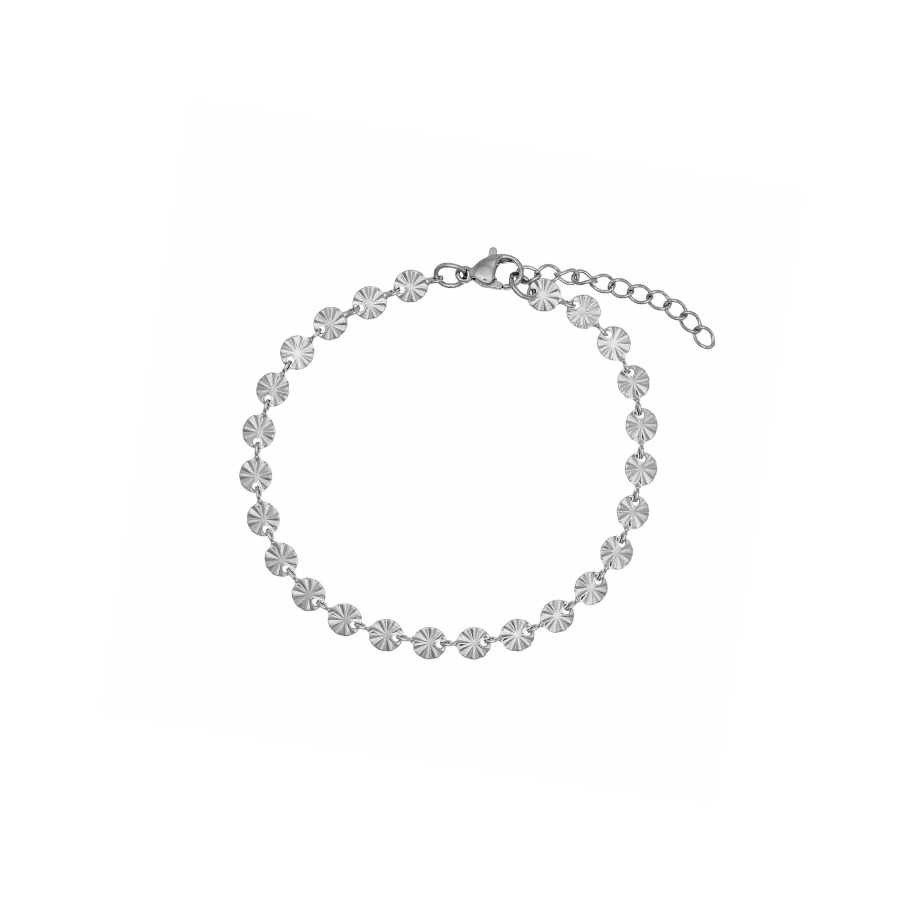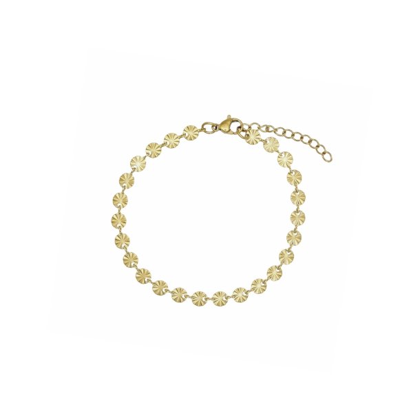 Flot armbånd i rustfrit ædelstål. Armbåndet har fine, små vedhæng med prægninger, som reflekterer lyset smukt. Brug det alene eller kombinér den med dine andre yndlings-armbånd.
