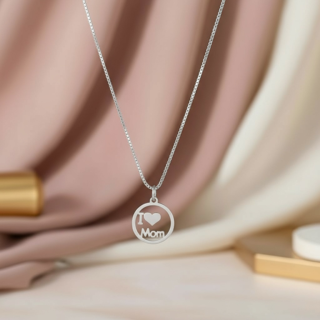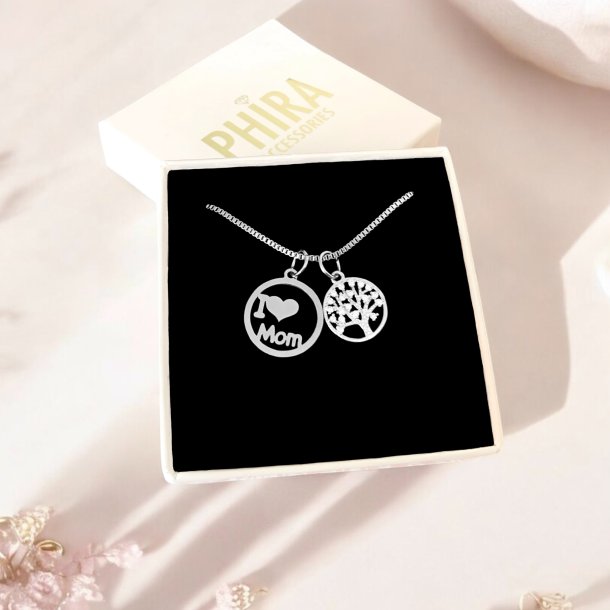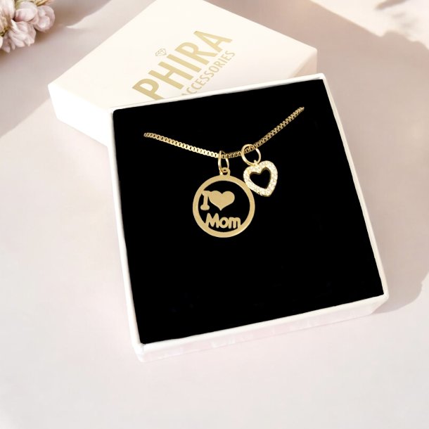 Flot vedhæng (uden kæde) med skriften "I ♥ mom". Vedhænget er af rustfrit stål med en smuk, blank overflade. Brug vedhænget alene eller kombinér det med vores andre fine vedhæng.