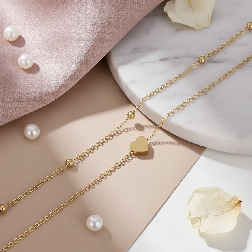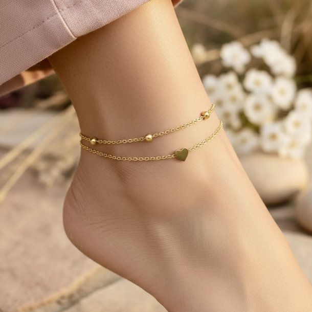 Flot dobbelt-ankelkæde med hjerte-vedhæng. Ankelkæden er af rustfrit ædelstål og passer til ethvert look.